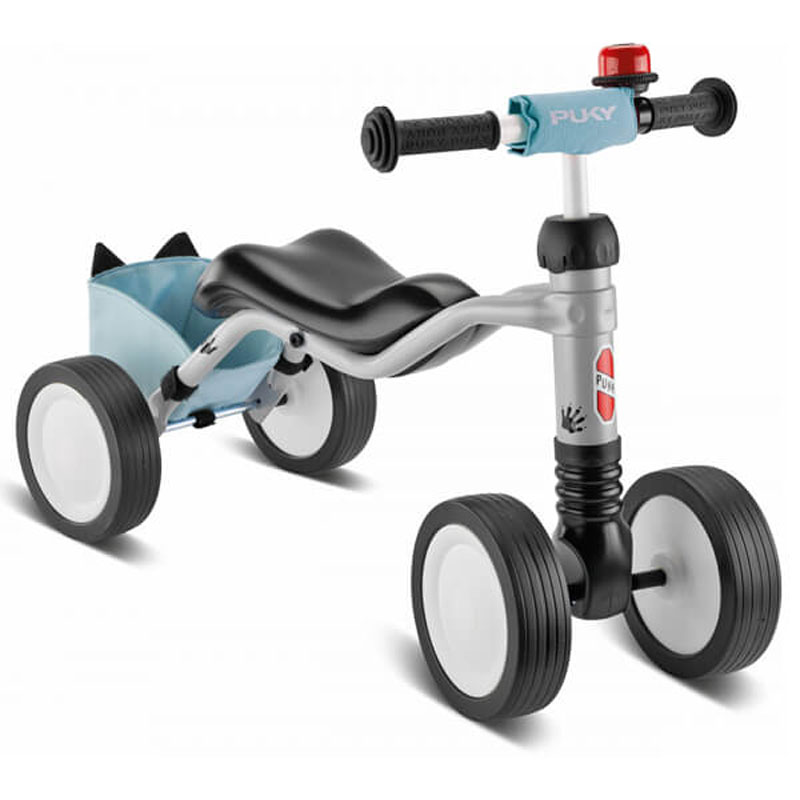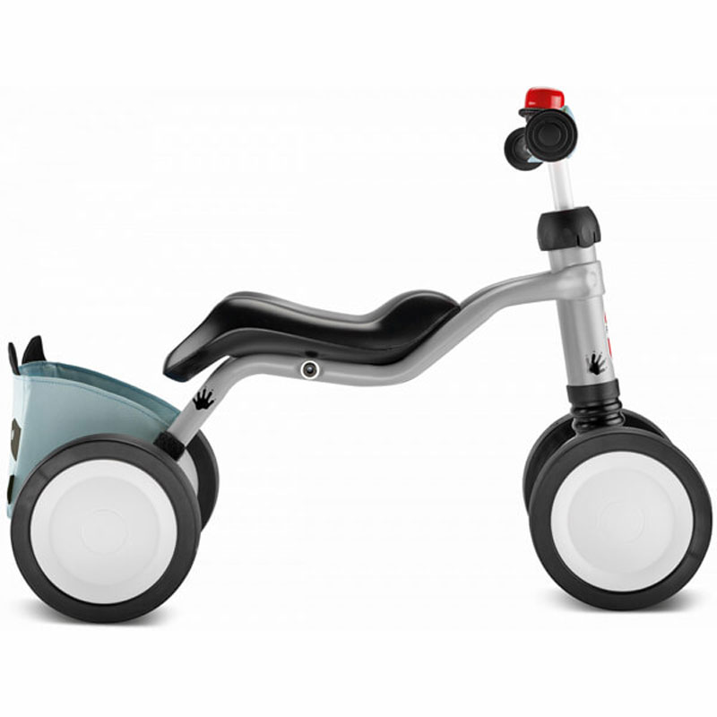 PUKY Wutsch Bundle колело за яздене с четири колела – нещо, което просто трябва да имате. Освен че може да го използвате и на открито, и на закрито, светло сивото колело за яздене е оборудвано с чанта за рамка в нежно син цвят с дизайн на енот със сладки ушички. Това ще позволи на вашето дете да слага в нея както любимите си играчки, така и бутилка за вода. А за още по-голямо забавление, това колело за яздене има и звънец на кормилото.
